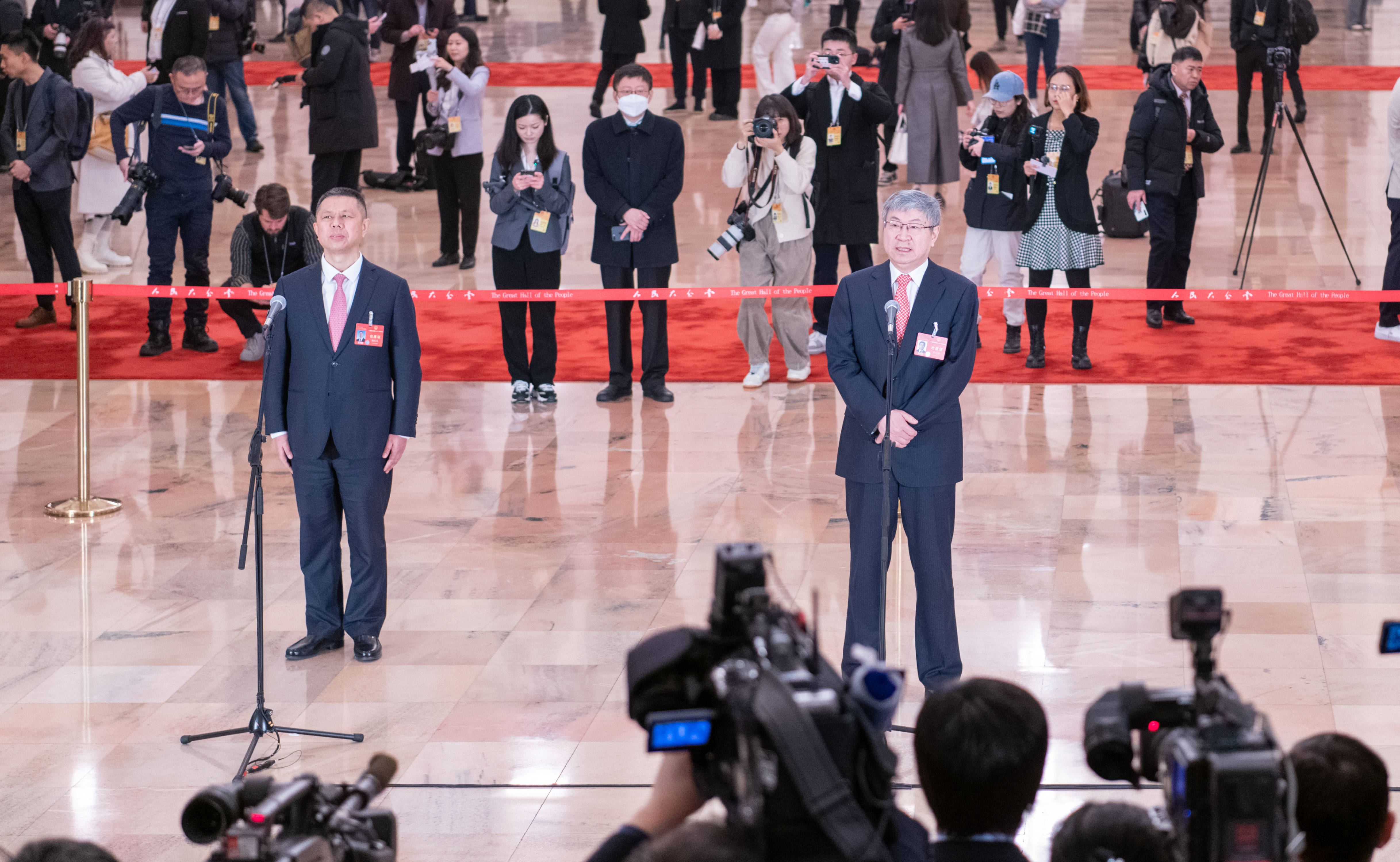 3月5日,十四屆全國人大二次會議首場“代表通道”采訪活動在北京人民大會堂舉行。圖為奇瑞控股集團董事長尹同躍代表(右)、天合光能股份有限公司董事長高紀(jì)凡代表接受記者采訪。 本報記者 王建軍 攝