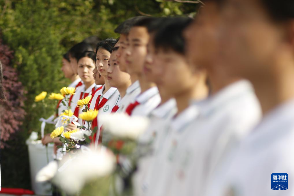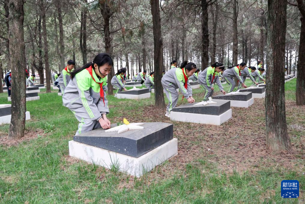 4月2日,在位于河北省石家莊市的華北軍區(qū)烈士陵園,學(xué)生們?yōu)楦锩⒘耀I花。
