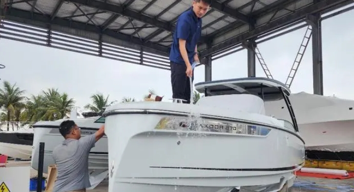 工作人員在清洗抵達(dá)游艇碼頭的參展游艇。記者 汪承賢 攝