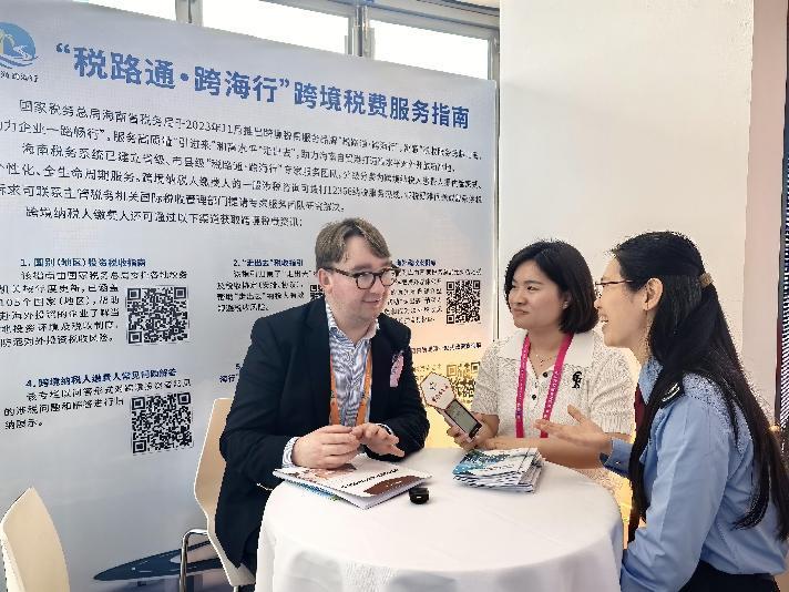 海南稅務(wù)部門“稅路通·跨海行”跨境稅費(fèi)服務(wù)團(tuán)隊為參展商和現(xiàn)場觀眾提供中英雙語稅收服務(wù)。海南省稅務(wù)局供圖