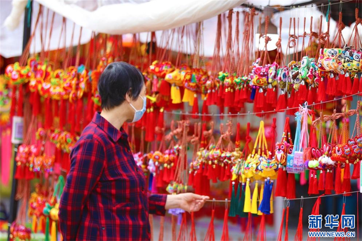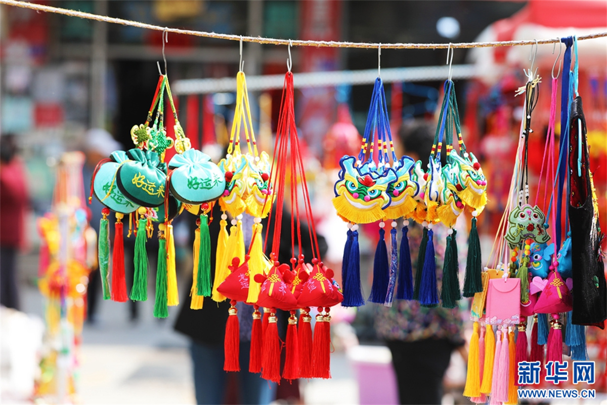 端午節(jié)臨近,甘肅省平?jīng)鍪兄行某菂^(qū)的攤位上掛滿了各式各樣的香包、手鏈等,色彩斑斕、醇香撲鼻,吸引不少市民前來選購(gòu)。新華網(wǎng)發(fā)(祁秋謹(jǐn) 王靖樂 攝)
