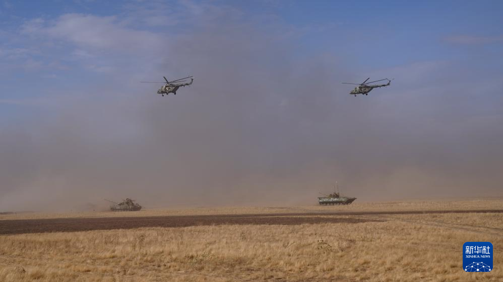 2021年9月23日,在俄羅斯奧倫堡州東古茲靶場(chǎng)舉行的“和平使命-2021”上海合作組織聯(lián)合反恐軍事演習(xí)實(shí)兵實(shí)彈演習(xí)中,多國(guó)聯(lián)合部隊(duì)進(jìn)行陸空協(xié)同作戰(zhàn)。新華社記者 梅世雄 攝