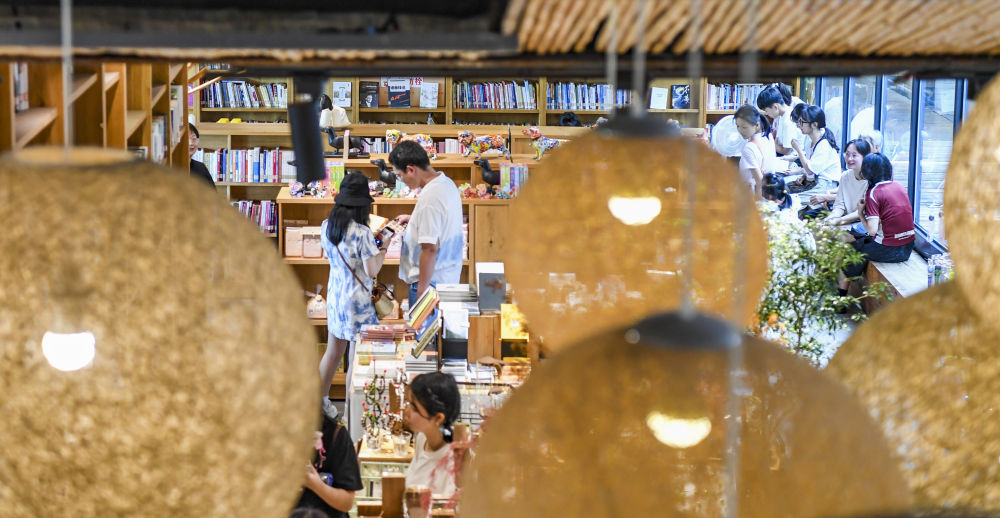 ↑7月15日,游客在重慶市江北區(qū)北倉(cāng)文創(chuàng)街區(qū)休閑、選購(gòu)文創(chuàng)商品。