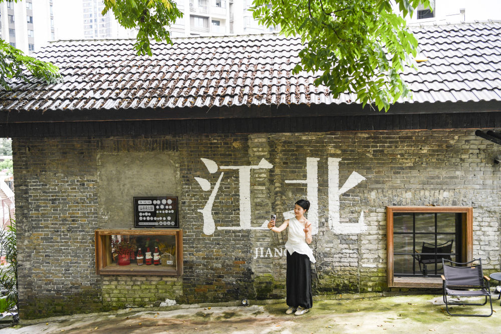 ↑7月15日,游客在重慶市江北區(qū)北倉(cāng)文創(chuàng)街區(qū)游覽。