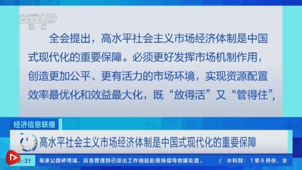 央視網(wǎng)消息:《中國共產(chǎn)黨第二十屆中央委員會第三次全體會議公報(bào)》指出,到二〇三五年,全面建成高水平社會主義市場經(jīng)濟(jì)體制。全會對進(jìn)一步全面深化改革做出系統(tǒng)部署,強(qiáng)調(diào)構(gòu)建高水平社會主義市場經(jīng)濟(jì)體制,而高水平意味著社會主義市場經(jīng)濟(jì)體制更加系統(tǒng)完備和成熟定型。