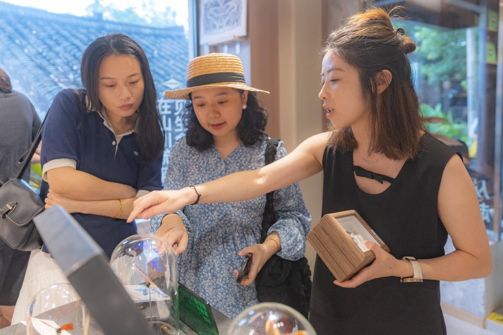 7月28日,在龍門(mén)浩老街·下浩里,青年創(chuàng)業(yè)者曾進(jìn)(右一)在她主理的方舟遺留物·標(biāo)本工作室內(nèi)為游客講解標(biāo)本知識(shí)。新華社記者 黃偉 攝