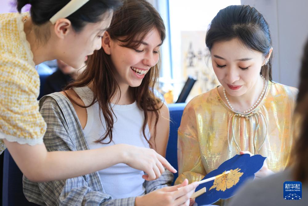 8月8日,在G7393次列車上,一名外國(guó)旅客體驗(yàn)制作金箔扇。