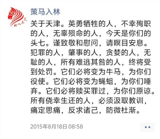 以上三帖,分別為天津8·12濱海新區(qū)爆炸事故“頭七”、山東平度平邑發(fā)生傷民案件、聲援鐵肩擔(dān)道義記者等所發(fā)。多年來(lái),一些案事件頻頻發(fā)生,源于當(dāng)事地方或部門(mén)瀆職不作為或?yàn)E權(quán)亂作為,造成嚴(yán)重后果,令人觸目驚心。正氣感召,責(zé)無(wú)旁貸,匕首投槍?zhuān)矣诙窢?zhēng)。