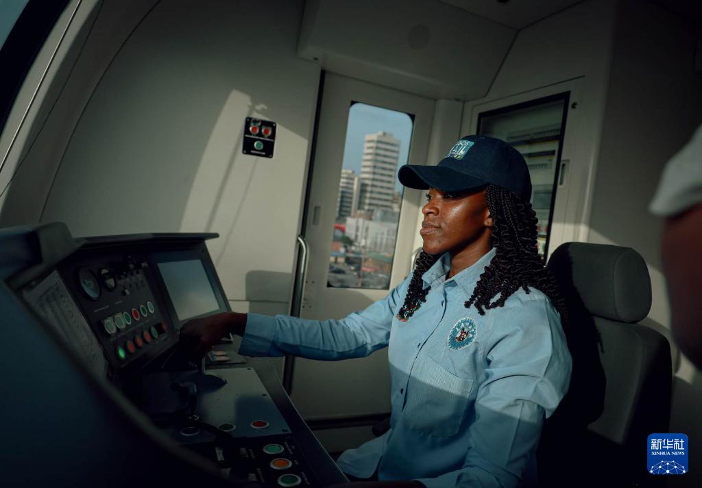 8月12日,在尼日利亞拉各斯,拉各斯輕軌藍線項目動車組列車司機組長伊莎貝拉·亞當(dāng)斯·伊斯拉埃爾在輕軌列車上工作。新華社發(fā)(中土集團尼日利亞有限公司供圖)