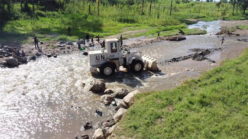 2023年6月7日,在剛果(金)南基伍省卡萊亥地區(qū),中國第26批赴剛果(金)維和工兵分隊官兵進行施工作業(yè)。