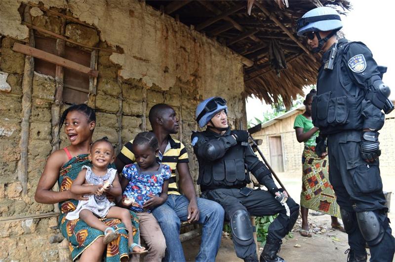 2015年11月3日,在利比里亞格林維爾一座村莊,中國維和警察防暴隊隊員詢問近期治安等情況。
