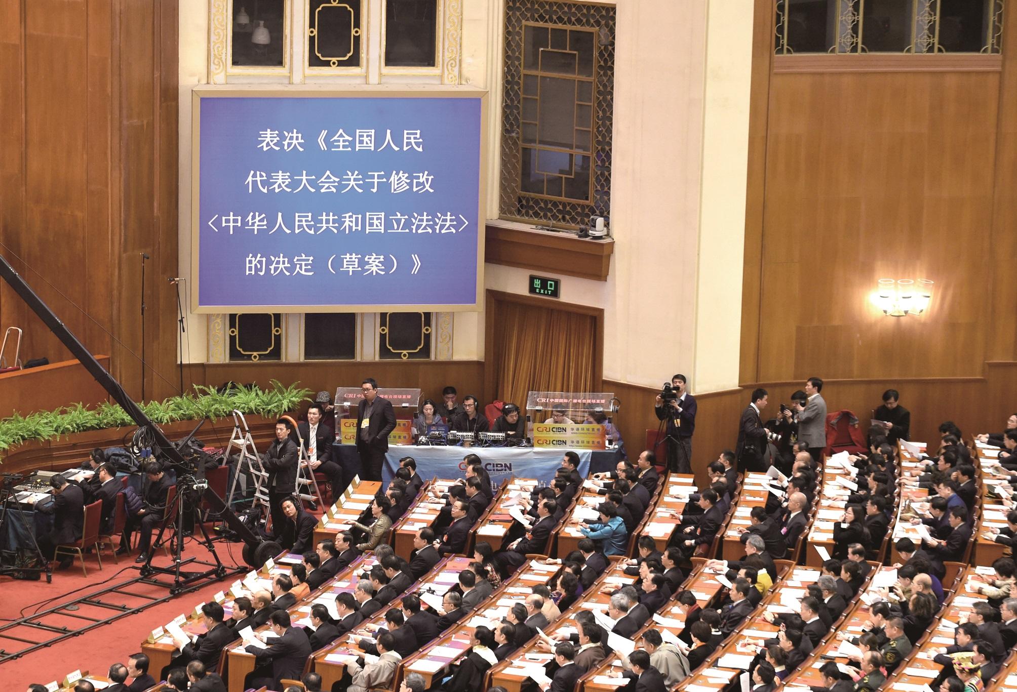2015年3月15日,十二屆全國(guó)人大三次會(huì)議表決通過關(guān)于修改立法法的決定。 本報(bào)記者 楊晉峰 攝