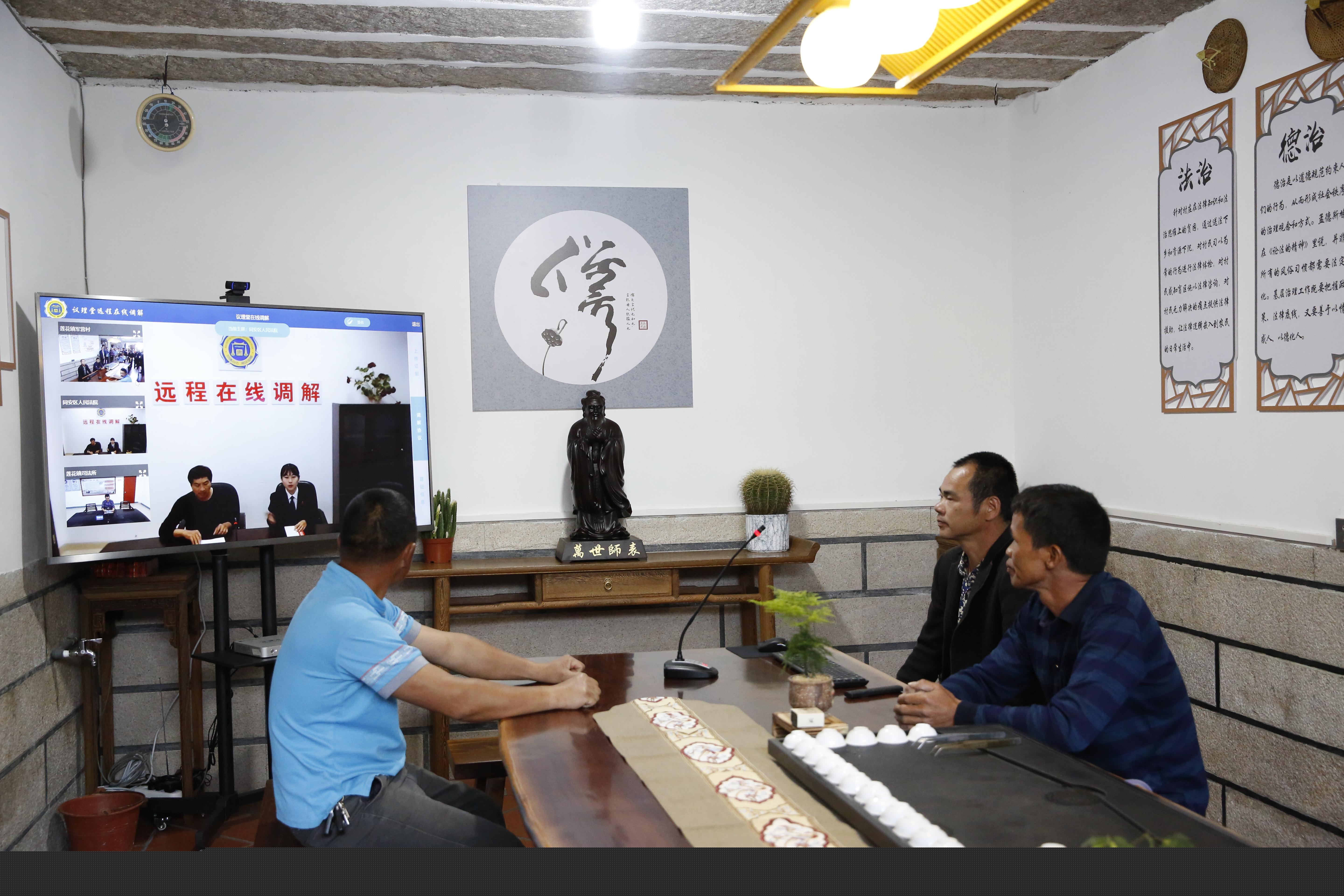 軍營村“高山議理堂”中,同安區(qū)人民法院、蓮花鎮(zhèn)司法所的工作人員正在為村民遠(yuǎn)程調(diào)解矛盾解紛、普法。受訪者供圖
