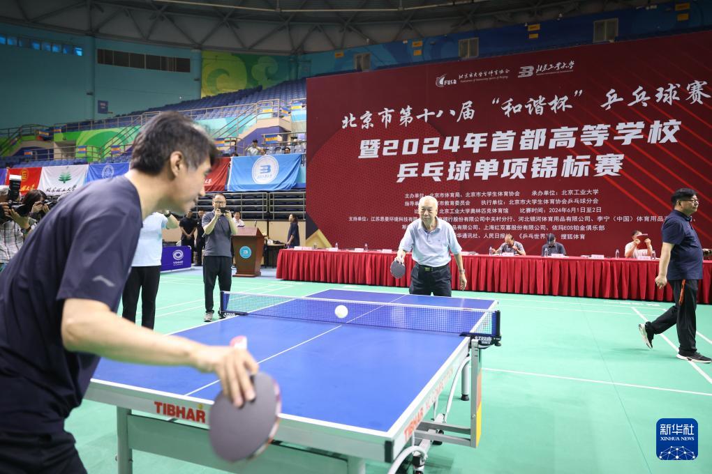 這是2024年6月1日,張燮林(后中)為北京市第十八屆“和諧杯”乒乓球賽暨2024年首都高等學(xué)校乒乓球單項錦標賽開球。新華社發(fā)