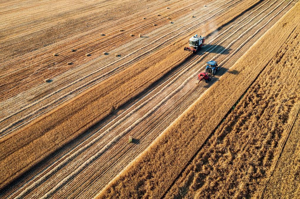2024年5月27日,農機手駕駛農機在河南省商丘市梁園區(qū)孫福集鄉(xiāng)崔樓村收獲小麥(無人機照片)。新華社發(fā)(李恒 攝)