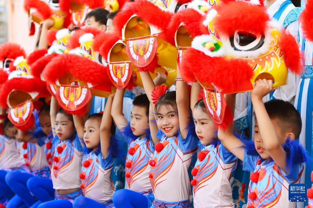 9月27日,在山東青島北仲路第一小學(xué)開展的國(guó)慶主題系列活動(dòng)上,小學(xué)生在表演獅子舞。
