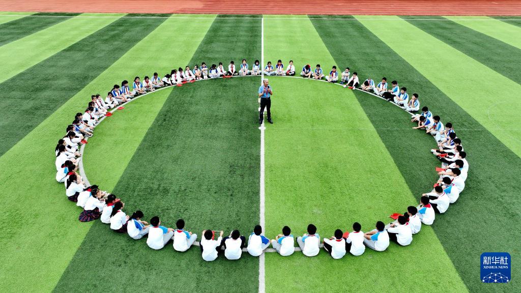 9月27日,在浙江省湖州市德清縣上柏小學,老黨員為學生們講紅色故事(無人機照片)。