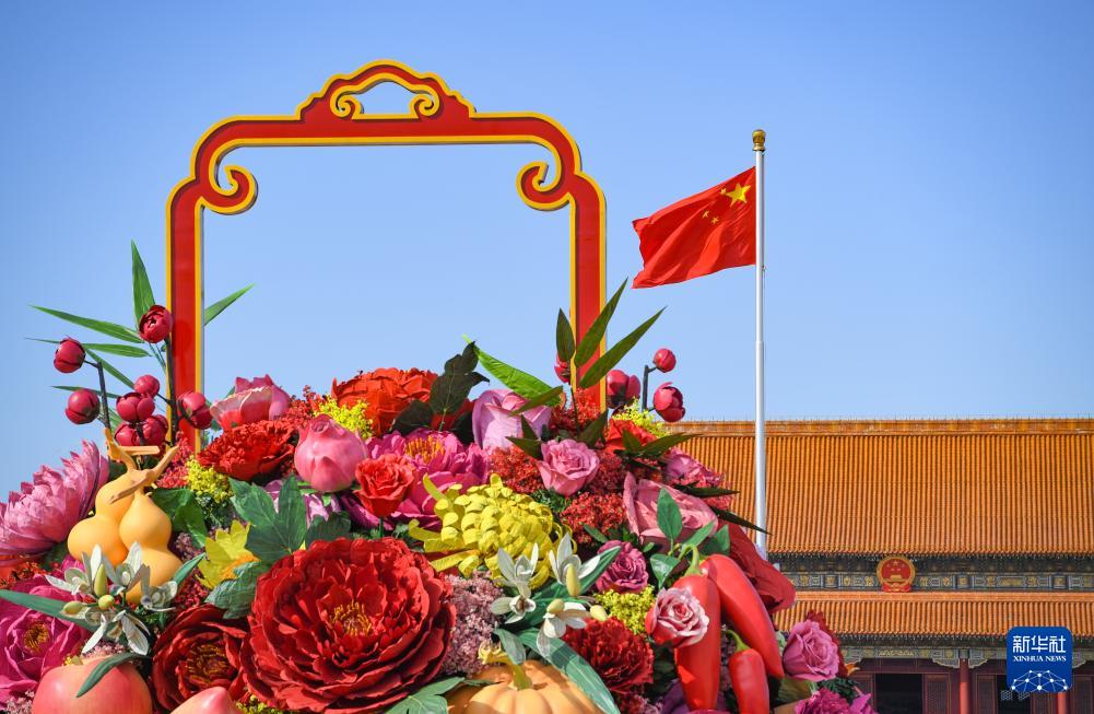 9月25日在天安門(mén)廣場(chǎng)拍攝的“祝福祖國(guó)”巨型花籃南側(cè)。