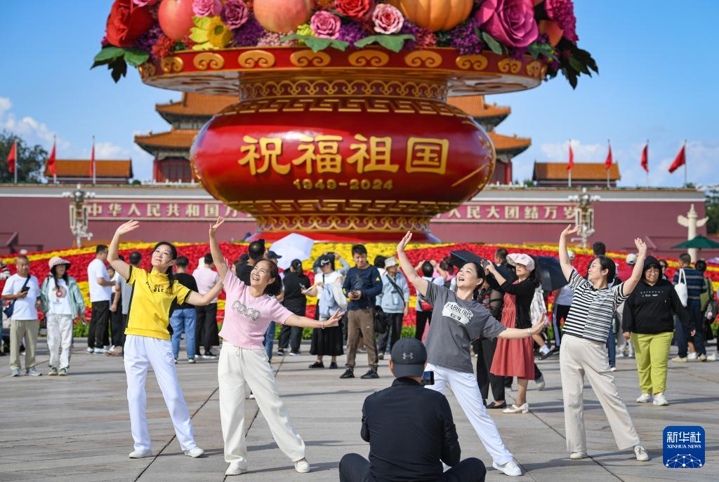 9月25日,人們?cè)谔彀查T(mén)廣場(chǎng)“祝福祖國(guó)”巨型花籃南側(cè)留影。