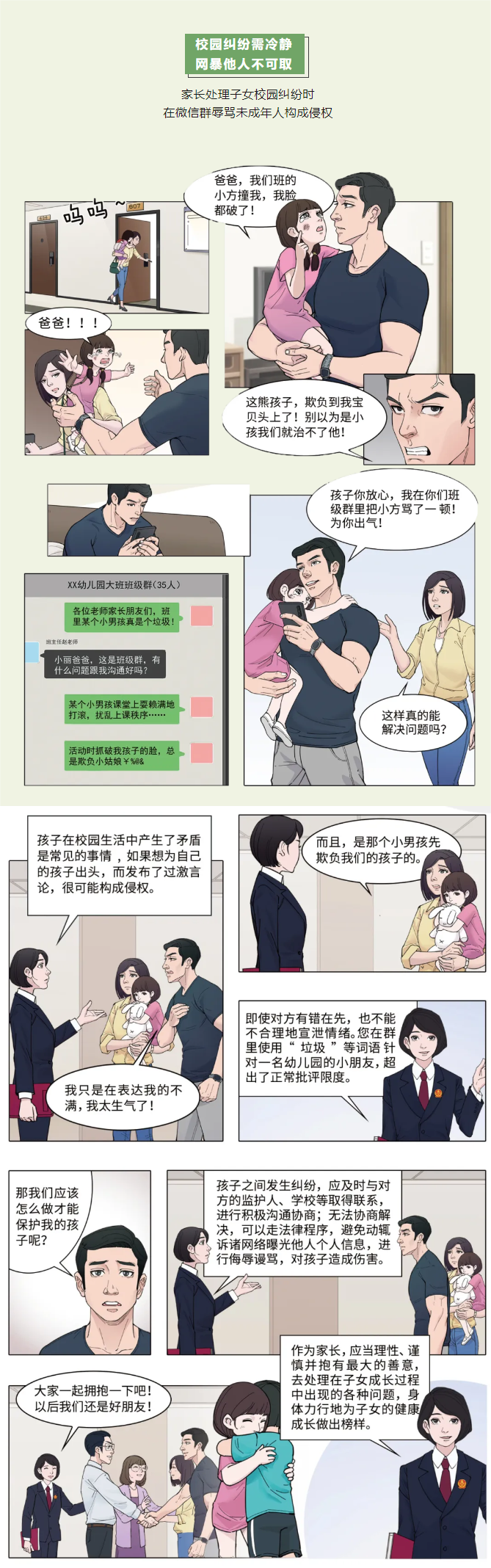 本案針對互聯(lián)網(wǎng)時代校園糾紛的線上化明確了行為邊界。兒童的身心尚未成熟,需要國家、家庭、學(xué)校、社會特殊的保護(hù)和照料。幼兒園是學(xué)齡前兒童除家庭之外最重要的生活學(xué)習(xí)場所,對于幼兒園同學(xué)之間產(chǎn)生的糾紛,家長應(yīng)在充分理解兒童成長規(guī)律和身心特點的基礎(chǔ)之上理性對待、謹(jǐn)慎處理,不能生硬地套用成年人的標(biāo)準(zhǔn)判斷、評價其行為動機(jī)和邏輯,在充分了解事實的基礎(chǔ)上采取合理的溝通方式,避免因糾紛處理不當(dāng)對未成年人帶來次生傷害。