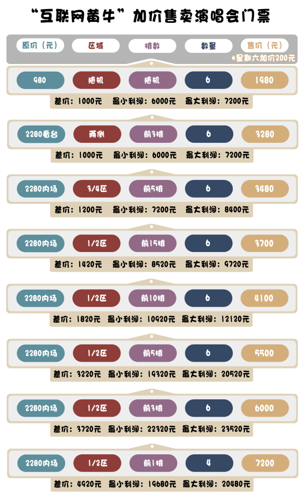 盡管如此,對于背后有二級資源的“互聯(lián)網(wǎng)黃?!眮碚f,售賣“黃牛”票并不是難事。以某位在廣東地區(qū)深受歡迎的歌手為例,其預計在今年11月舉行多場個人演唱會,但有粉絲表示,演唱會的門票仍“一秒售罄”。某二手置物平臺數(shù)據(jù)顯示,演唱會門票并非全部售空,部分門票流入“互聯(lián)網(wǎng)黃?!敝?,原價為2280元的內場票,因位置不同被炒至3280元至7200元不等。此外,若趕上演唱會在星期六舉辦,買家還需要額外支付200元的“熱門時段搶票費用”。面對“一人一證”的入場機制,“互聯(lián)網(wǎng)黃?!钡纳馑坪醪⑽词艿接绊?。