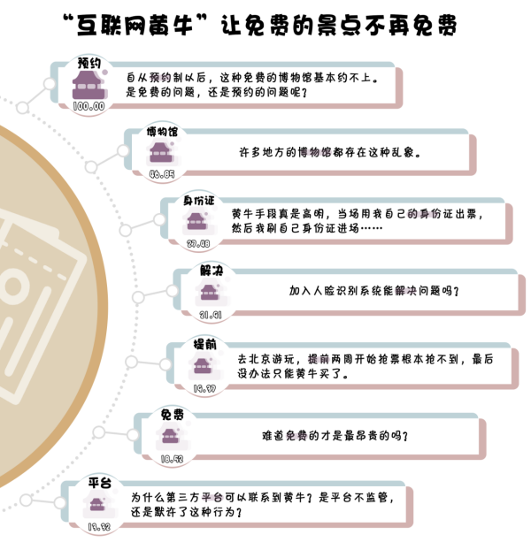 如此“作弊”手段引發(fā)輿論熱議。有網(wǎng)民表示,多地免費景點都存在預約不上的現(xiàn)象,想去游玩必須花錢,其中博物館成“重災區(qū)”;有網(wǎng)民感嘆“互聯(lián)網(wǎng)黃?!笔侄沃呙髁钊瞬坏貌环?,其已經(jīng)默許了“互聯(lián)網(wǎng)黃?!爆F(xiàn)象;部分網(wǎng)民反映,某些第三方平臺上,免費預約門票被裹上“講解服務”“研學套餐”等外衣,搖身一變成為貨架上的商品,不禁令人發(fā)問,“互聯(lián)網(wǎng)黃?!睘楹慰梢悦髂繌埬懙卦诘谌狡脚_上售賣免費預約門票?是官方平臺監(jiān)管不力、置之不理,還是其授意“互聯(lián)網(wǎng)黃牛”與第三方平臺相互串通謀取利益?