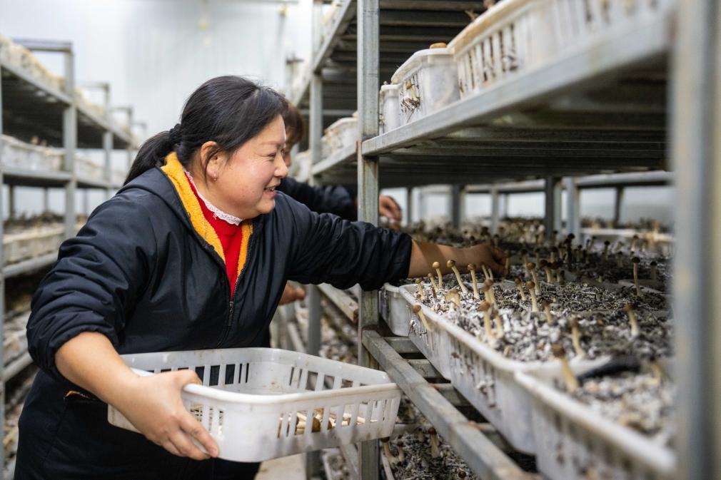 11月26日,在益陽市資陽區(qū)沙頭鎮(zhèn)富興村集體經(jīng)濟合作社基地,農(nóng)戶在采摘菌子。新華社記者阮周圍 攝