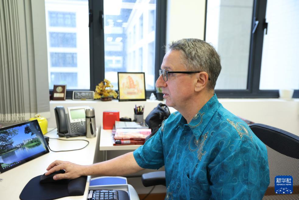 2024年11月21日,澳門(mén)城市大學(xué)葡語(yǔ)國(guó)家研究院的助理教授、來(lái)自葡萄牙的若昂·西蒙斯(中文名朱奧)在辦工室工作。新華社記者 王露 攝