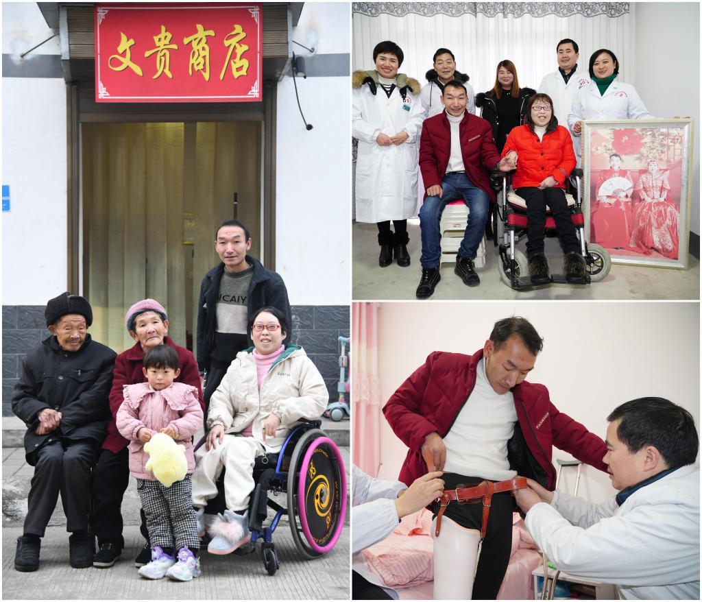 這是一張拼版照片。左圖為:2024年12月29日,牟文貴(后)、曹曉霞(右一)與家人在自家開設(shè)的商店前合影(新華社記者張博文攝);右上圖為:2019年1月6日,新年剛拍完結(jié)婚照的牟文貴(前左)夫婦與他們的家庭醫(yī)生簽約服務(wù)團隊合影(新華社記者邵瑞攝);右下圖為:2019年1月6日,家庭醫(yī)生團隊的醫(yī)生在為右腿截肢的牟文貴(中)穿戴義肢(新華社記者邵瑞攝)。