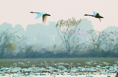 小天鵝在湖南岳陽市東古湖濕地上空飛翔。近年來,該地實施退耕還濕等工程,吸引越來越多候鳥來此越冬棲息。曹正平攝/光明圖片