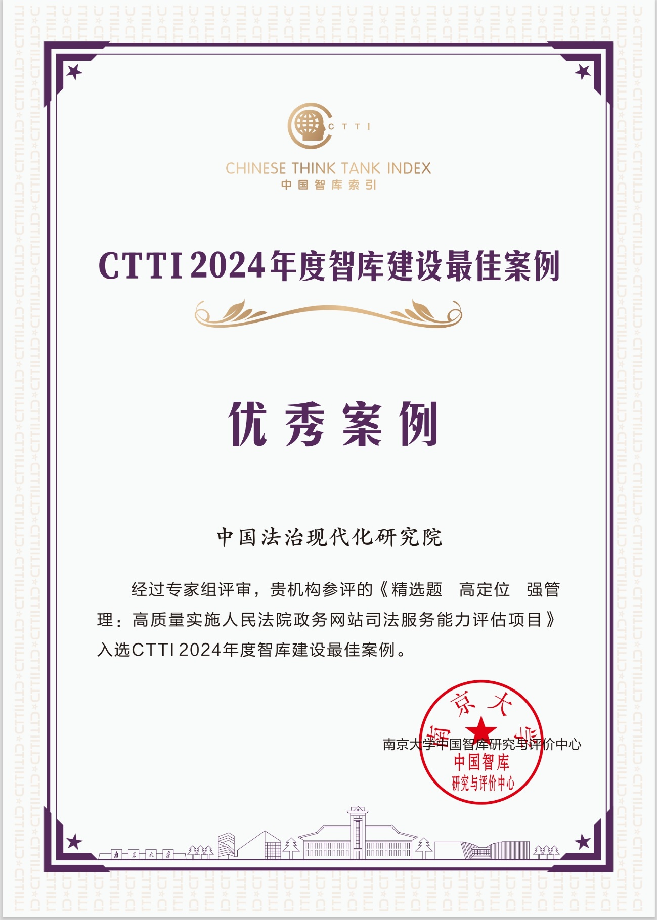 2024年12月7日,南京大學(xué)中國(guó)智庫(kù)研究與評(píng)價(jià)中心公布,南京師范大學(xué)中國(guó)法治現(xiàn)代化研究院的《精選題 高定位 強(qiáng)管理:高質(zhì)量實(shí)施人民法院政務(wù)網(wǎng)站司法服務(wù)能力評(píng)估項(xiàng)目》入選CTTI2024年度智庫(kù)建設(shè)最佳案例優(yōu)秀案例。