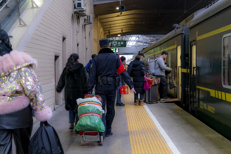 沃荻值乘的K27次列車從北京發(fā)往遼寧丹東,單次往返耗時(shí)兩天,他需要連續(xù)值乘兩個(gè)來(lái)回,共計(jì)4天。春運(yùn)期間,旅客數(shù)量激增,沃荻的工作量也隨之加大?!按哼\(yùn)期間旅客特別多,比平時(shí)要操心許多,我們的職責(zé)就是確保每一位旅客安全返鄉(xiāng)”。