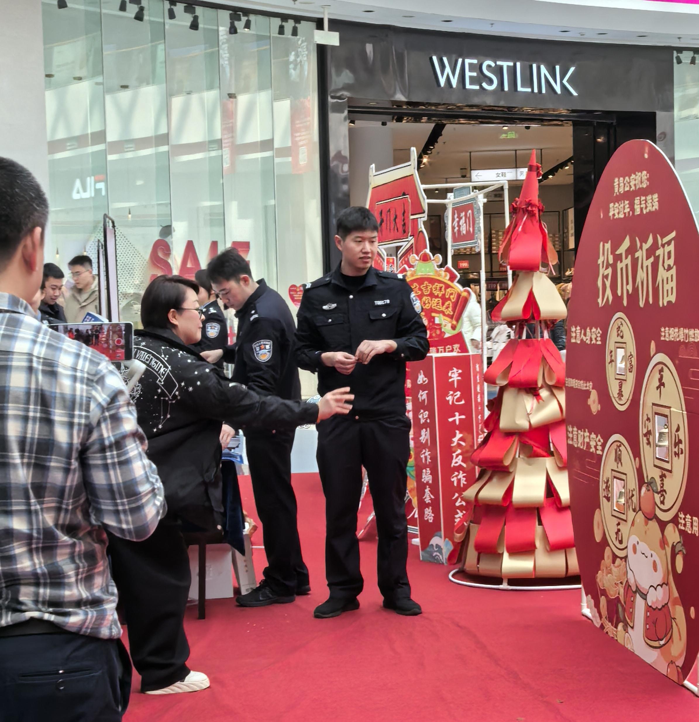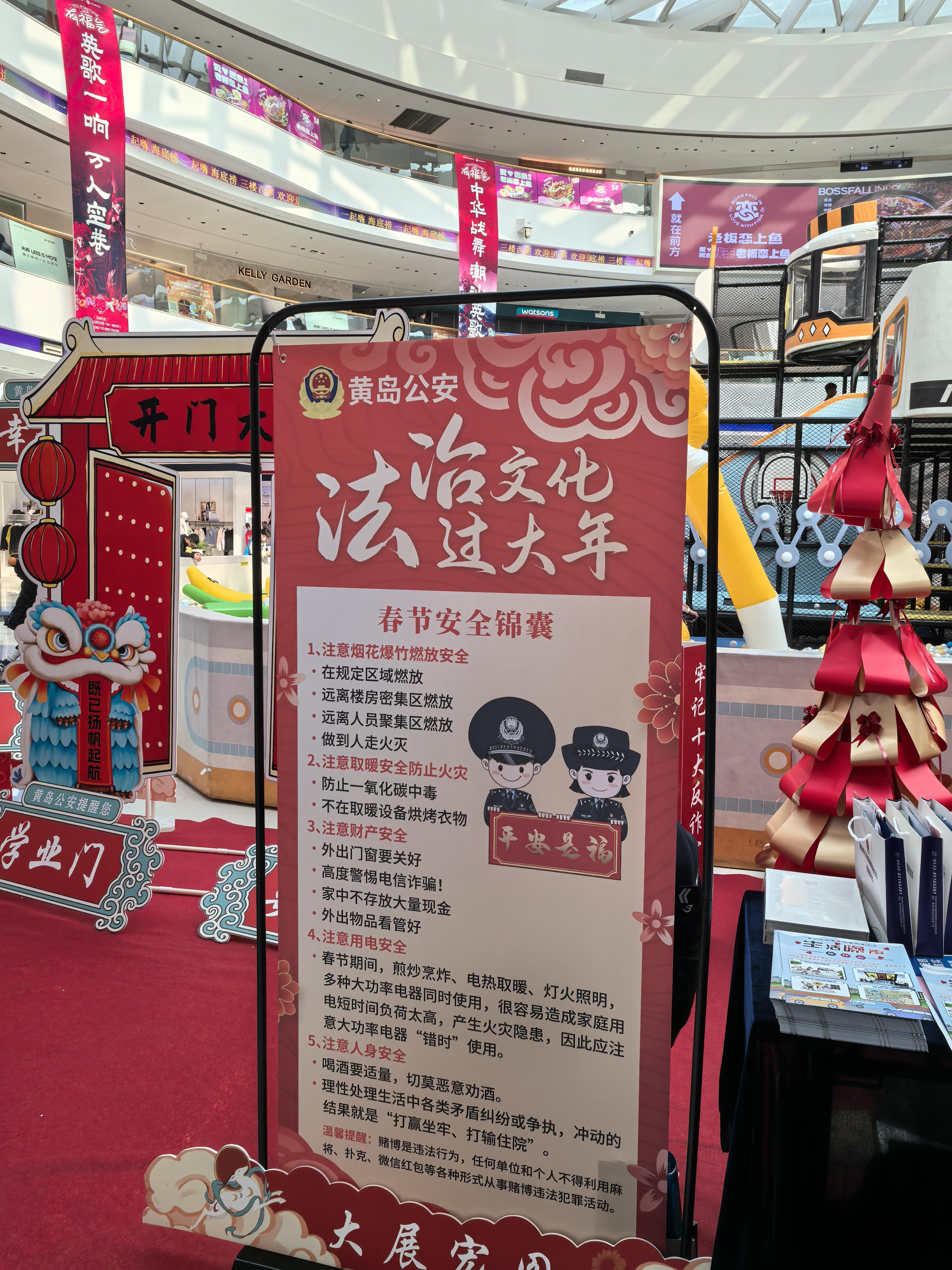新春佳節(jié),山東省青島市黃島區(qū)某大型商場內(nèi)張燈結(jié)彩,人頭攢動(dòng),洋溢著濃濃的節(jié)日氛圍。在商場中央展廳,黃島公安組織的“法治文化過大年”宣傳活動(dòng)正如火如荼地進(jìn)行。