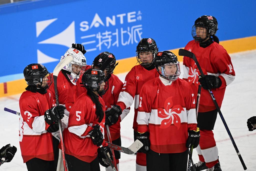 2月3日,中國(guó)香港冰球女隊(duì)球員在比賽結(jié)束后。新華社記者 陳振海 攝