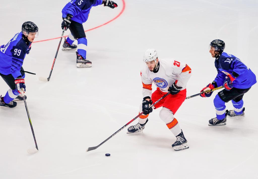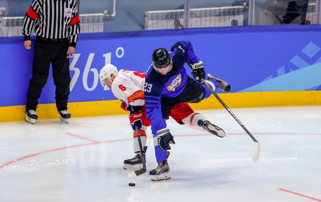 2月3日,吉爾吉斯斯坦冰球隊(duì)球員賽福洛夫(右二)在比賽中。新華社記者 王建威 攝