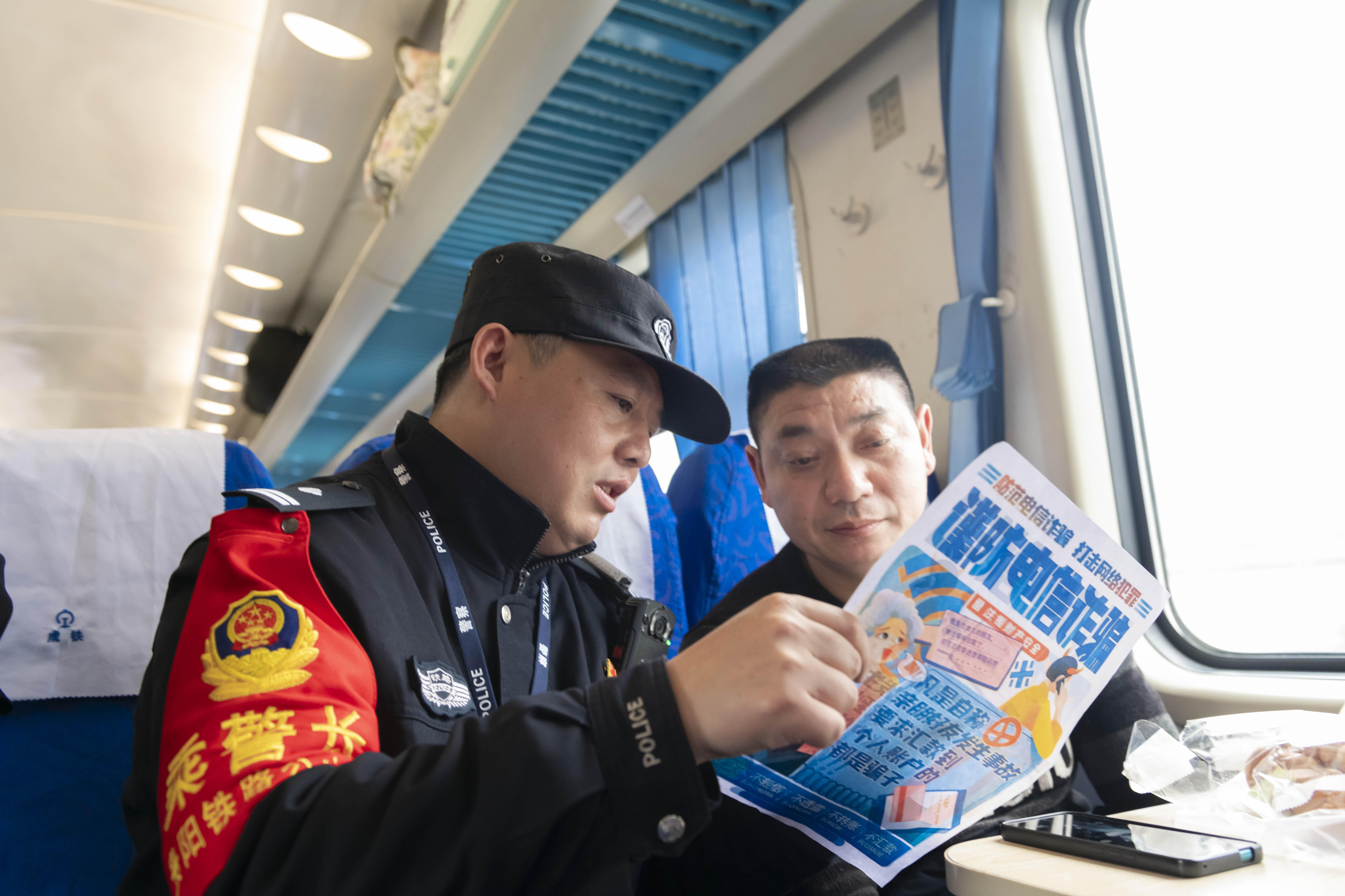 圖為潘廣杰(左)正在向旅客普及防范電信網(wǎng)絡(luò)詐騙知識。(貴陽鐵路公安處供圖)
