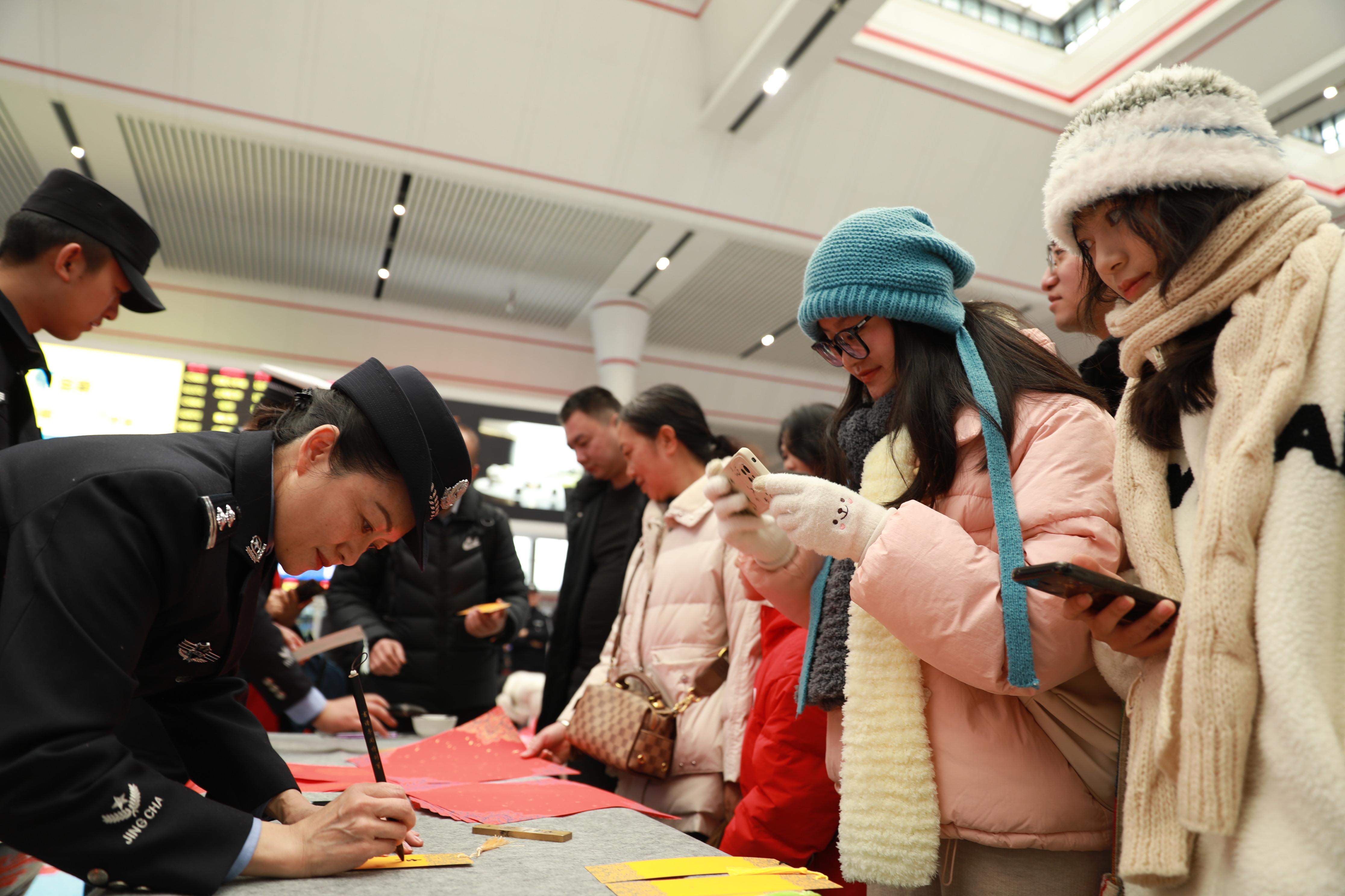 春運首日,貴陽北站內(nèi),年味正濃,數(shù)位鐵路公安民警正揮毫潑墨,用毛筆在一張張四方紅紙上寫下“?!薄跋病薄捌桨病薄跋矘贰钡却硇麓鹤85拇笞帧<t紙黑字間,傳遞著鐵路警方對乘客們的溫暖關(guān)懷。一位領(lǐng)到“福”字的乘客笑著說:“沒想到在車站還能收到這么特別的禮物,心里暖暖的。”