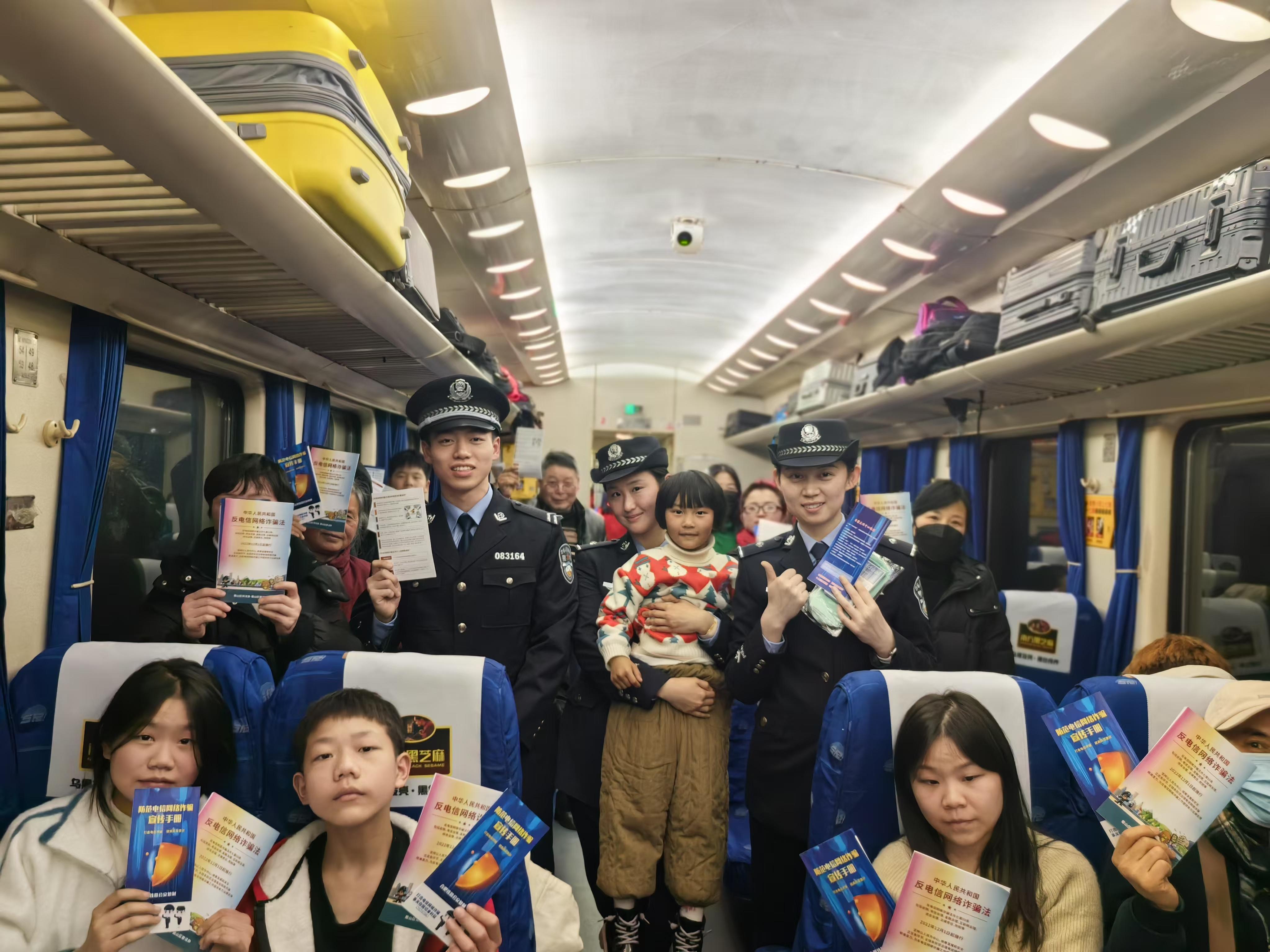 圖為民警與旅客手舉防范電信網(wǎng)絡詐騙宣傳手冊合影留念。