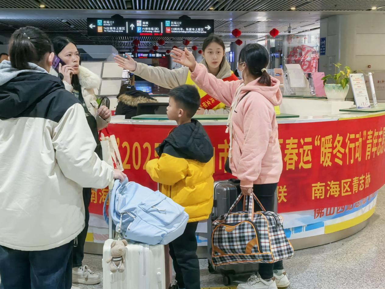 圖為南海區(qū)志愿者為過(guò)路旅客指路。通訊員 鄒轢瓊 攝