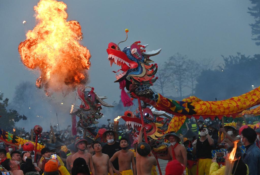 走進(jìn)賓陽縣炮龍文化廣場,在爆竹炸響的塵煙中,6條舞動(dòng)的彩龍仿佛騰云駕霧。圍觀群眾看準(zhǔn)龍頭低垂的時(shí)機(jī),將手中早已備好的鞭炮拋掛到龍頭龍身之上,霎時(shí)間火樹銀花。護(hù)龍隊(duì)首尾隨龍而進(jìn),火焰師將腰簍中的“火藥”順著燃燒的竹火把拋撒至空中,一團(tuán)火焰飛起惹得人潮驚呼,將炮龍節(jié)氣氛推至高潮。