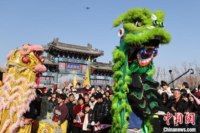 2月9日,河北省霸州市勝芳古鎮(zhèn)傳統(tǒng)花會巡游正式拉開帷幕。從農(nóng)歷正月十二到正月十六,50余道花會將輪番登場展示各自絕活,為當?shù)厝罕姾陀慰瞳I上傳統(tǒng)文化盛宴。圖為2月9日,霸州市勝芳古鎮(zhèn)花會活動中,獅子會表演現(xiàn)場。賈珺 攝
