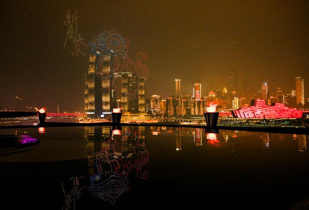 圖為在重慶拍攝的無人機(jī)表演。春節(jié)期間,多場無人機(jī)表演在重慶朝天門長江、嘉陵江兩江交匯處精彩上演。新華社記者 王全超 攝