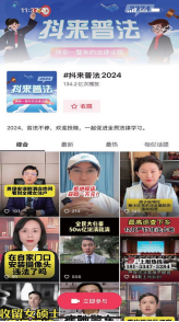 抖音“抖來普法”系列活動,年度話題播放量超百億,頭部法律作者對活動的參與率高達(dá)95%,最高法、最高檢等公檢法司政務(wù)機構(gòu)也積極參與。截至2024年12月,#抖來普法2024年度長線普法系列活動,播放量134.2億次,共計上萬名法律創(chuàng)作者發(fā)布相關(guān)內(nèi)容。系列活動如下:
