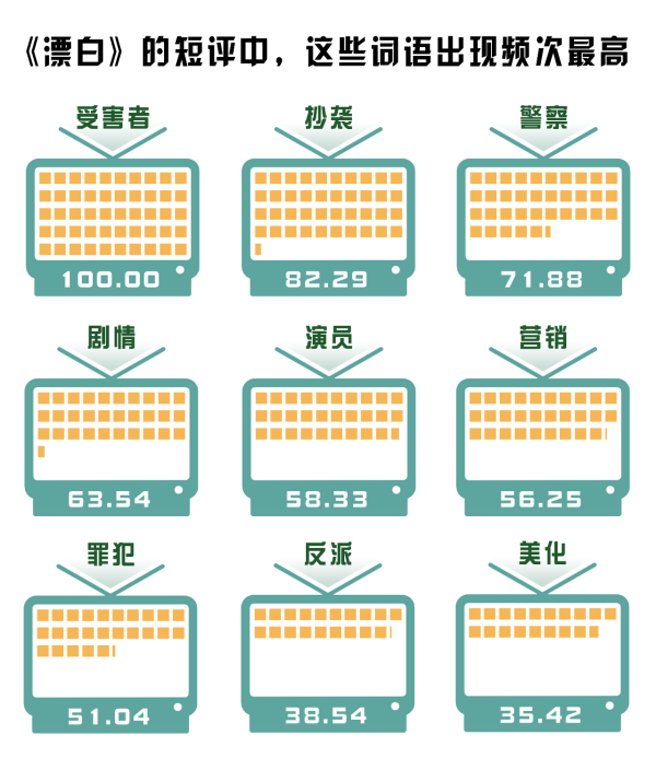 (制作:法治網(wǎng)輿情中心 數(shù)據(jù)來(lái)源:選取400條《漂白》豆瓣短評(píng),對(duì)短評(píng)做分詞及歸一化處理,進(jìn)行分詞后將熱度最高的詞語(yǔ)規(guī)定為100)