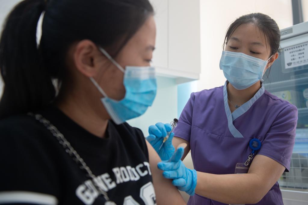 2020年4月3日,博鰲超級醫(yī)院的護士給一位女士接種HPV疫苗。 新華社記者 張麗蕓 攝