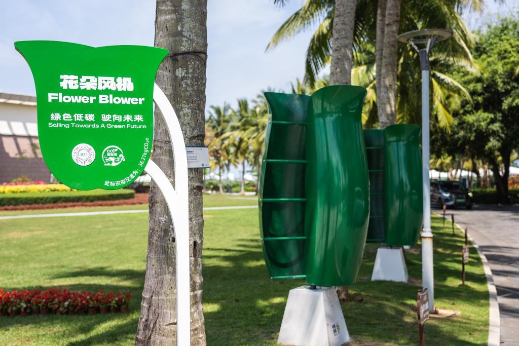 這是2024年3月27日拍攝的博鰲近零碳示范區(qū)內(nèi)的花朵風機?;ǘ滹L機用來收集風能,是島內(nèi)可再生能源利用項目之一。新華社記者 曹夢瑤 攝