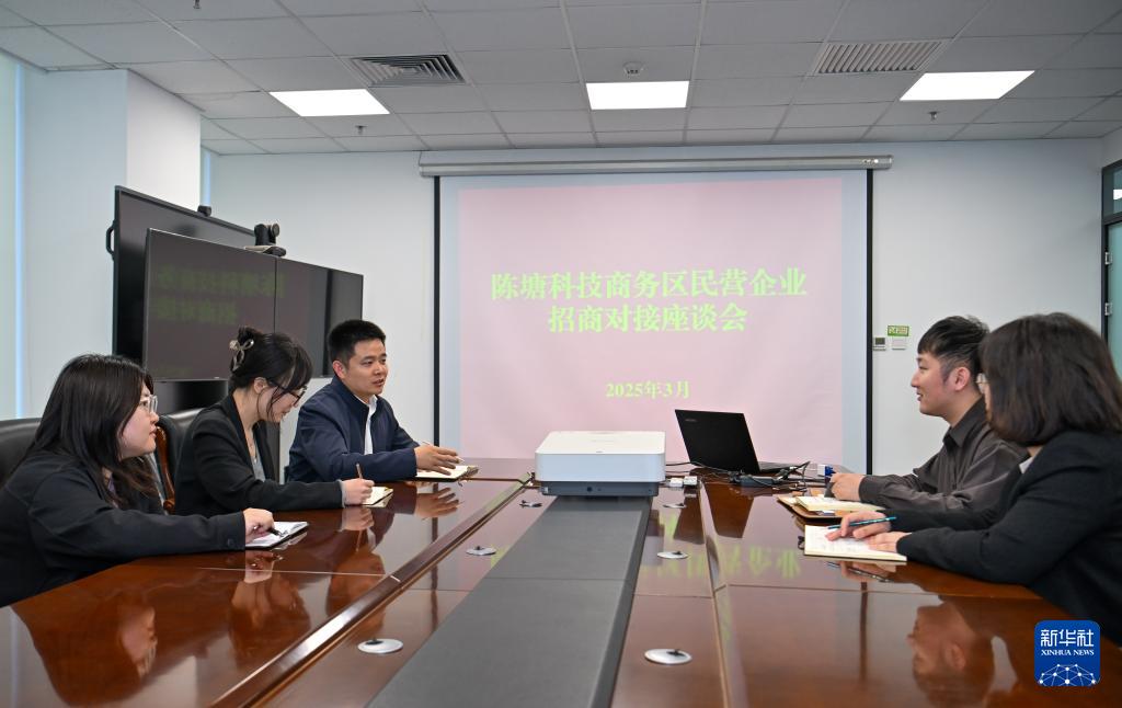 3月28日,在天津陳塘科技商務(wù)區(qū)管理委員會,工作人員就商務(wù)區(qū)招商工作進(jìn)行討論。