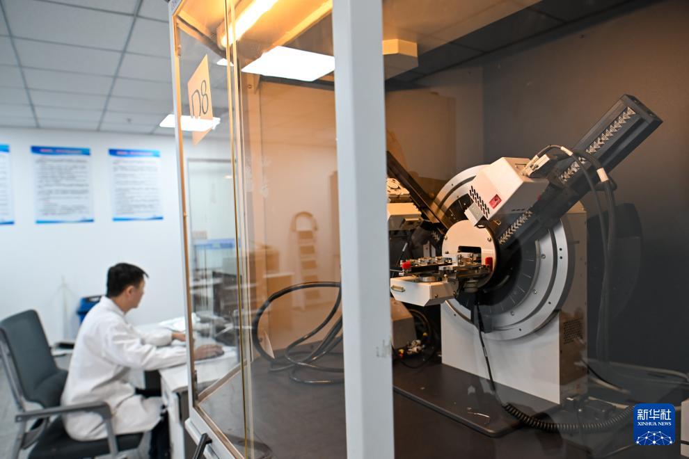 在天津陳塘科技商務(wù)區(qū)天津知微材料科技有限公司,檢測人員通過X射線多晶衍射儀進(jìn)行材料分析(3月26日攝)。