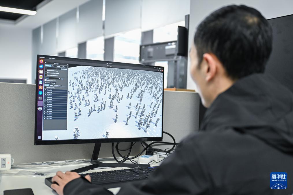 ??3月13日,工程師付龍在驗證機器人動作模型訓練效果。