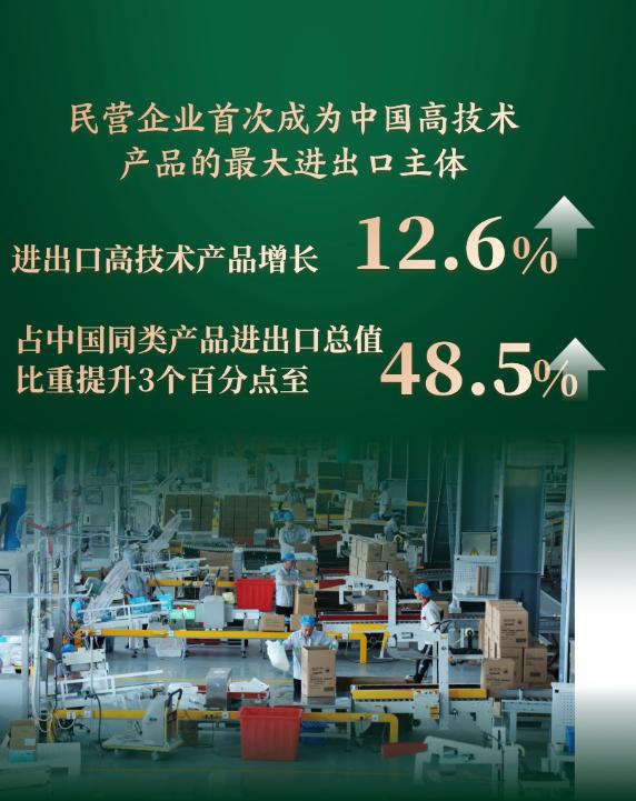 民營(yíng)企業(yè)首次成為中國(guó)高技術(shù)產(chǎn)品的最大進(jìn)出口主體,進(jìn)出口高技術(shù)產(chǎn)品增長(zhǎng)12.6%,占中國(guó)同類產(chǎn)品進(jìn)出口總值比重提升3個(gè)百分點(diǎn)至48.5%。